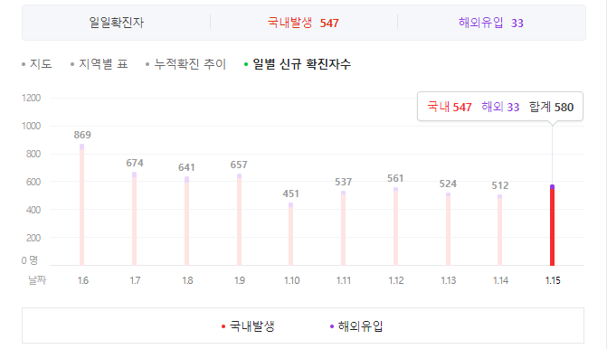 신규확진자는 580명으로 5일째 500명대를 유지되었고,