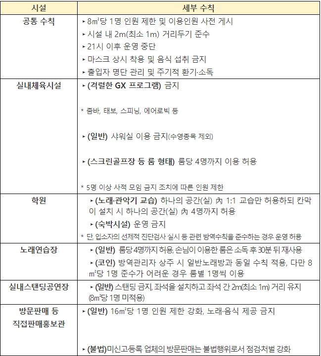 < 수도권 집합금지 시설 대상 방역조치 조정방향 >